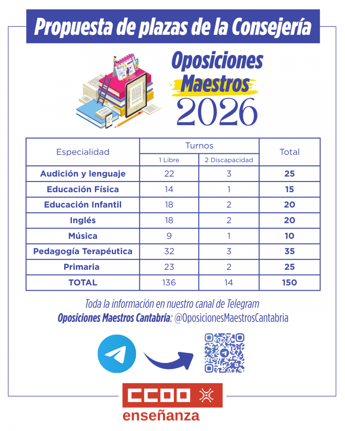 Estas 150 plazas supone aplicar la tasa de reposición del 100%, no del 120%, tal y como permiten los Presupuestos Generales del Estado. Desde CCOO hemos pedido que la tasa de reposición se sitúe en el 120% y se convoquen más plazas para el cuerpo de Maestros.